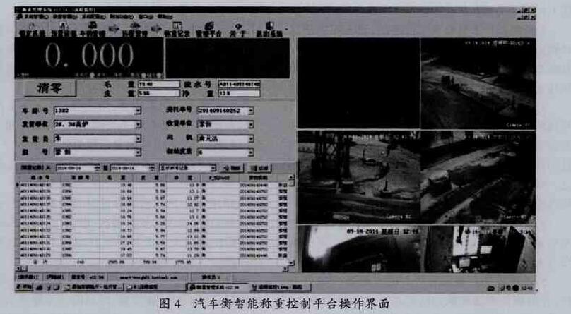 地磅智能稱重控制平臺(tái)主要由工控機(jī)和各 類信息采集模塊組成,其功能包括標(biāo)簽電子標(biāo)簽信 息采集與管理、地磅稱重?cái)?shù)據(jù)采集和管理、視頻 圖像采集與管理、車輛磅秤輔助系統(tǒng)、LED大屏幕 等,圖4為地磅智能稱重控制平臺(tái)操作界面。
